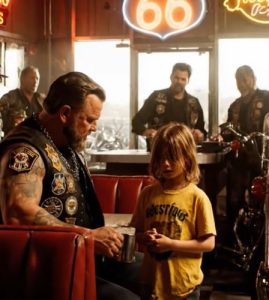 While the club waited for the sirens to pierce the desert silence, Bear didn’t leave the girl’s side. He sat her on the counter and asked the waitress for the largest chocolate milkshake the diner had. He told her stories about the road, about the mountains they’d seen, and about the “Iron Horses” parked outside.