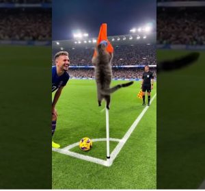 As one player gently nudged the ball away, the cat perked up with sudden interest. Then, in a surprising burst of determination, it pounced toward the rolling ball, tapping it with its tiny paw before darting away. The crowd roared louder than they had for any goal that evening.