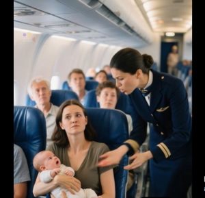 He leaned slightly forward, speaking quietly but firmly to the flight attendant. โ€œPerhaps we should make an exception. She has a baby. Let her stay seated.โ€