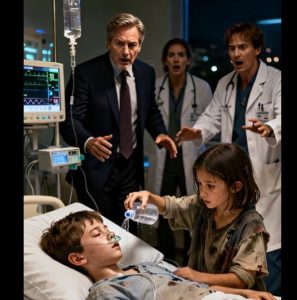That afternoon, as gray rain tapped against the hospital windows, a quiet commotion stirred in the hallway. A small figure stood near the nurses’ station—a thin girl wearing worn-out shoes and a faded dress. Her dark hair hung loosely around her shoulders, and she clutched a small glass bottle filled with clear water.