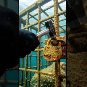 One diver gently cleared the sand and seaweed surrounding the cage, exposing the locking mechanism. Another positioned specialized cutting tools, preparing to open the structure without injuring the trapped animal.