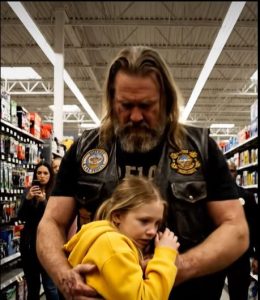As he moved through the store, the biker approached the toy aisle. Children looked up curiously, sensing a different kind of energy around him. One little girl, no more than five, stared wide-eyed at his hands, which were adorned with rings and scars from decades of riding. Her mother, following closely behind, urged her to be careful, whispering about strangers and safety. But the girl took a bold step forward, fascinated rather than frightened.
