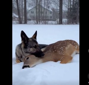 Over the next hour, the two played a careful, deliberate game. The cat would dart ahead, Buddy would follow, slow and patient, never rushing her. She would pounce on leaves and twigs, and he would nuzzle them gently, encouraging her to interact. Lily watched from a distance, amazed at how two creatures who had every reason to be wary of one another were forming a bond that seemed natural, effortless, and extraordinary.