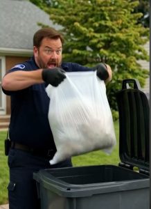 Without hesitation, she rolled up her sleeves and climbed slightly onto the edge of the bin to reach down. The kitten let out another weak cry as she carefully lifted it from the pile of garbage.
