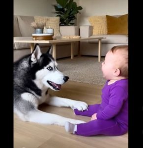 The morning sunlight poured gently through the living room window, casting soft golden rays across a carpet strewn with colorful toys. The air was filled with the warm, familiar sounds of home: the faint hum of the refrigerator, the rustle of a blanket, and the occasional coo or giggle from a little human nestled comfortably on the floor. Today, however, the living room wasnโt just a place of quiet domesticityโit was a stage for a display of unfiltered happiness, starring a baby named Noah and his loyal husky, Luna.