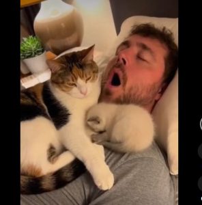 Sarah watched in half-amused disbelief as Whiskers climbed onto Markโs chest. The weight alone was enough to jolt him slightly, but he barely shifted. The snore continued.