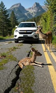 The fawn, likely wandering near its mother or exploring too close to the road’s edge, had slipped one of its slender legs deep into the crack. In panic, it struggled to pull free—but each frightened movement only wedged it tighter.