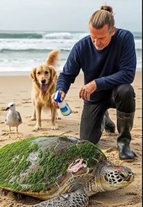 Once freed from the net, the turtle flopped slightly, flippers pushing against the sand in an instinctive attempt to reach the ocean. The man cradled it carefully in his hands, supporting its weight, while the dog barked softly, almost encouragingly.