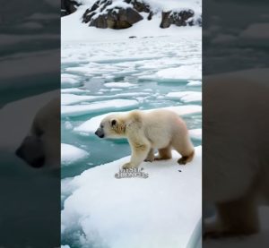 When they approached carefully, the cub let out a weak cry. Its soft white fur, normally thick and insulating, was damp and clumped with ice. Its small paws slipped on the frozen surface as it tried to walk, and its body trembled violently from exhaustion and cold.