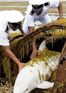 The rear hatch had fallen open at just the wrong angle, and the dolphinโs sleek body was wedged tight against the corroded metal. Her fins thrashed weakly, and I could see panic in her eye โ intelligent, aware, and desperate.