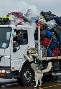 Kodi barked again, louder this time, then lunged forward in his harness, paws scrabbling against the seat. His blue eyes were locked on the road ahead, body tense with unmistakable alarm.