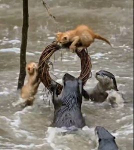 The father used his strong teeth carefully, biting through the thicker stems while avoiding the kittensโ delicate skin. Each snap of the vine loosened their grip, though the thorns scratched lightly at the ottersโ paws and faces.