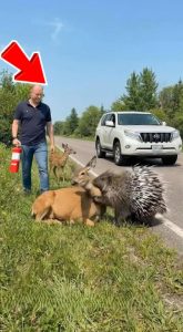 The deer wasnโt just standing thereโit was guarding. The porcupine had likely wandered too close, and now both animals were locked in a tense standoff. The porcupine wasnโt aggressive by nature, but its defense was dangerous. One wrong move from the deer could result in serious injury. At the same time, stepping away might leave the fawn exposed.