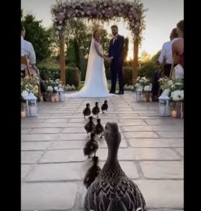 From the edge of the field, a group of ducks waddled toward the gathering. One by one, they crossed behind the last row of chairs, quacking quietly among themselves, completely unfazed by the formal setting. Children turned around in delight. Adults exchanged amused glances. Even the photographer shifted focus, capturing the absurdly perfect contrast between elegance and nature.