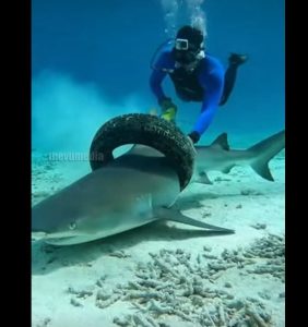 He signaled to his diving partner, who hovered nearby with a camera, documenting the rescue for safety and later reporting. Every motion was calculated. The diver assessed the tire first, noting how it had lodged itself around the sharkโ€™s midsection. With specialized underwater shears strapped to his belt, he began to work carefully, cutting through the rubber inch by inch. The shark reacted instinctively, twisting and trying to escape, but the diver remained calm, using his body and movements to protect both himself and the animal.