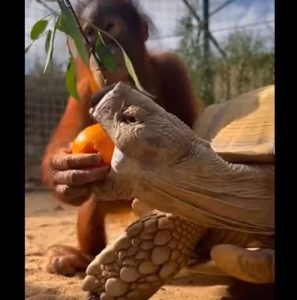 As the tortoise continued eating, a small piece of the orange rolled away. Once again, Bumi reached out and gently nudged it back within reach. There was no impatience in his movements, no sense of urgency. It was a quiet display of attentiveness that felt almost human in its intention. Visitors who later watched the footage would describe it as kindness, though no words were spoken and no instructions were given.