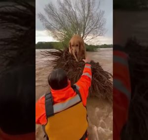 The pull was immediate and intense. The floodwaters fought back, tugging at the dogโs body as the rescuer strained against the rope. Other responders anchored themselves, adding their strength, boots digging into the soaked ground. Inch by inch, they drew the dog closer, its legs paddling uselessly in the rushing water. Onlookers shouted encouragement, some covering their mouths, others recording with shaking hands.