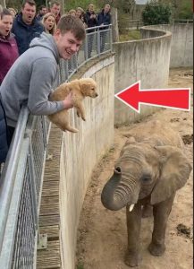 The Rescue The elephant doesn’t just move the puppy away; it actively works to bring it back toward the safety of the wall where the mother dog and the humans are waiting. It uses its trunk to guide the puppy, ensuring it doesn’t get hurt or wander further into the enclosure.
