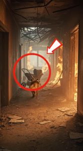 The descent was the most dangerous part. The dog moved carefully, step by step, staying close, ensuring the baby did not slip or fall. The smoke swirled around them, the heat intensifying, but the dog remained focused.