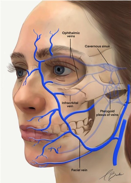 What makes this area different is the way blood vessels are connected beneath the skin. The veins in this part of the face are linked more directly to deeper structures in the head. Because of this, infections in this zone may have a different pathway compared to other areas of the body.