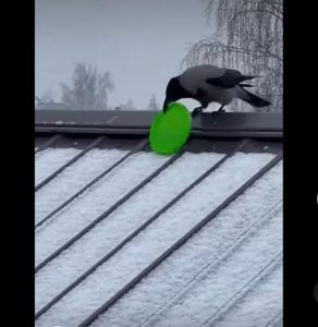 You won’t believe what this clever crow uses to slide down a snowy roof
