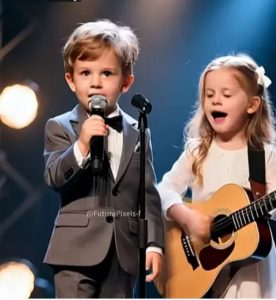 The moment the two children stepped onto the small stage, a ripple of smiles spread through the audience. They were barely tall enough to reach the microphone stand without standing on their toes, yet they carried themselves with a confidence that instantly captured attention. One held a microphone with both hands, gripping it tightly, while the other stood close by, glancing over with a grin that suggested they were sharing a secret joke. Even before the performance began, their energy filled the room.